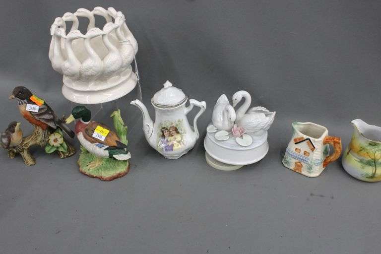 LOT 492 - Vintage Lefton Bird figures - Ring of Geese Planter/vase by Lenwile Ardalt Artware Japan - Two birds on a branch by Lefton Japan - and - Crossed Swords with a circle mark by HOMCO Malard duck - Holland Windmill creamer c. 1940s Japan - and others including Nippon small Pitcher, small Pitcher marked with an "S" and a horse head, Japan - Swan music book and more