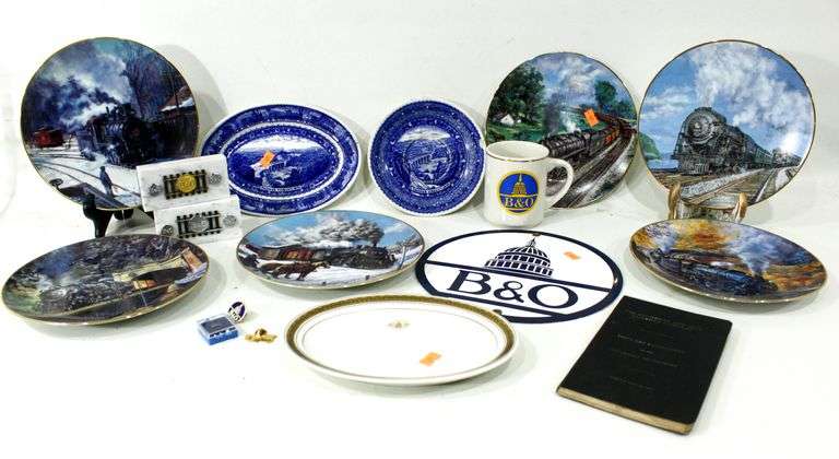 Baltimore & Ohio Railroad Memorabilia - Includes: B&O Railroad Gold Rim Plate Platter by Warwick Made in U.S.A. 1939 - and - Baltimore and Ohio Railroad Blue on White Pictorial Commemorative Plate Platter by Lamberton China - and - Hamilton Collection Signed and Numbered Limited Edition Railroad Collector Plates - and - More