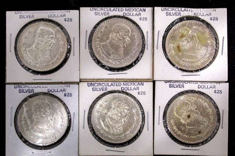 Uncirculated Mexican " Silver Dollars " 1958 - 1966 , 1 " UN " Peso , Contain 0.100 silver 6 items