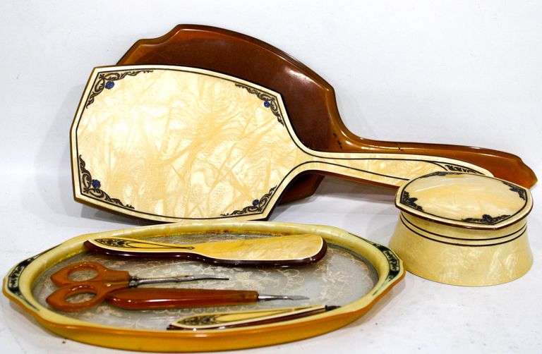 LOT 86 - Vintage Vanity Set - Mirror, Powder Puff Box, Tray & More.