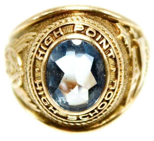 10 KT Gold High Point High School 1952 Class Ring, size 7, blue stone. ( 9.9 gm t.wt)