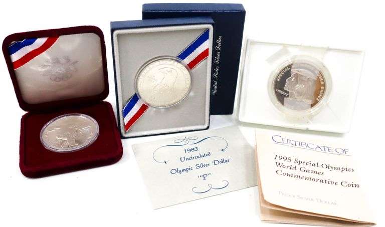 Commemorative Olympic Proof 90% Silver Coins. 1983 Marked Proof, 1983 Marked UNC, and 1995 Marked Proof Special.3 items Total.