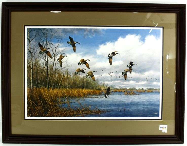Signed and Numbered 508/950 Limited Edition Canada Geese Flying into Marsh by David A. Maass (American, b. 1929) - 27 x 35