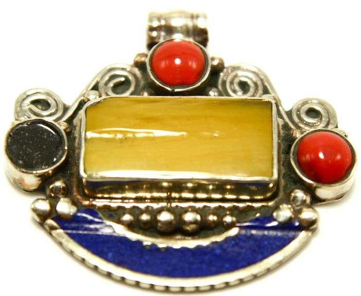 LOT 245 - Sterling Silver Native American Pendant set with coral, and lapis, missing one stone.