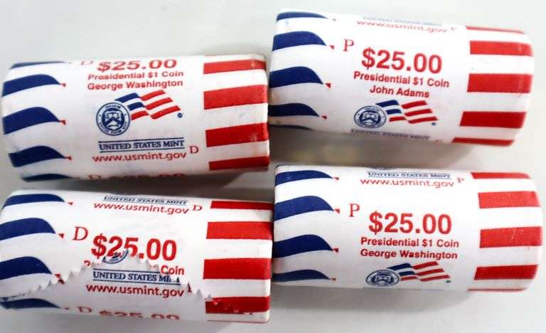 Uncirculated Rolls. "P" & "D" Washington Dollars. "P" & "D" John Adams Dollars. 4 Rolls Total.