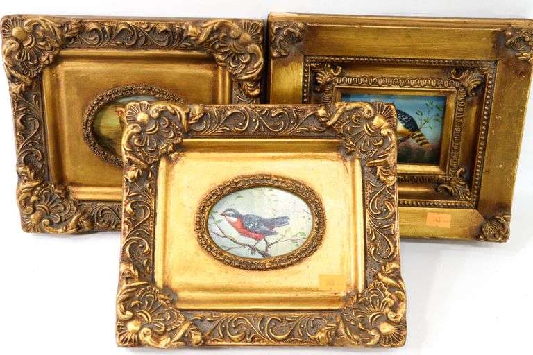 Set of three miniature paintings of birds, framed 8" x 9"
