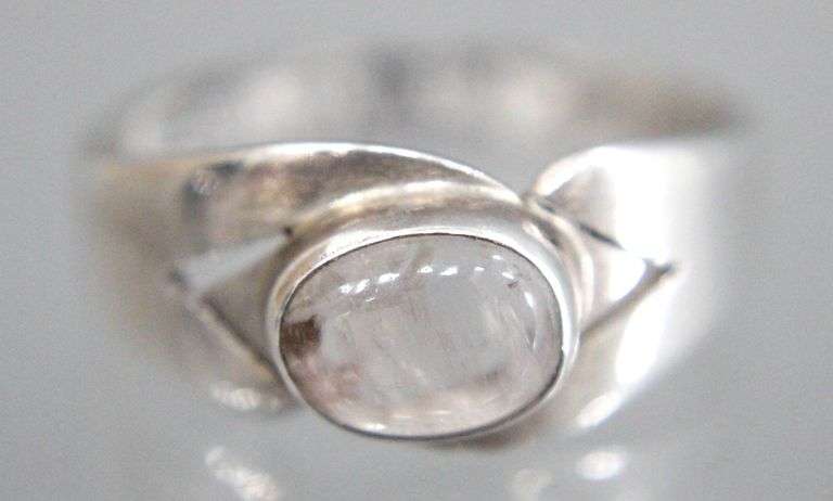 LOT 47 - Sterling Silver Ring set with a reticulated white stone with a purple flash, size 7.