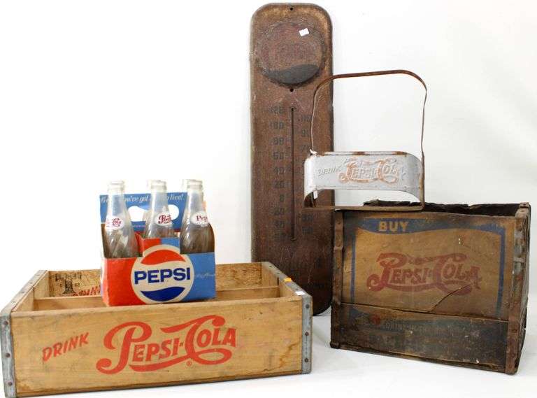 Vintage "Pepsi" Promotional Memorabilia - Wall Thermometer, Metal Bottle Caddy, Shipping Crate, Bottles and More