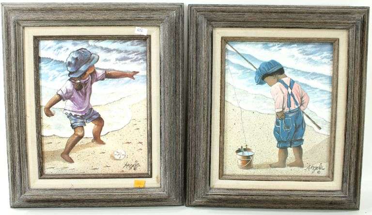 Blue Boy Throwing Stone on the Beach by Angela - and - Boy with Fish in a Bucket on the Beach by Angela - 15 x 13 each
