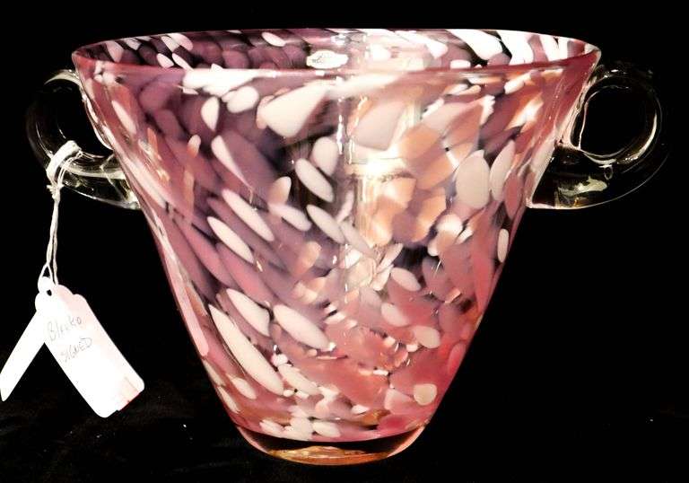 LOT 96 - Blenko Handcrafted Art Glass Centerpiece with Handles Made in USA - Intact Label - 7 x 11