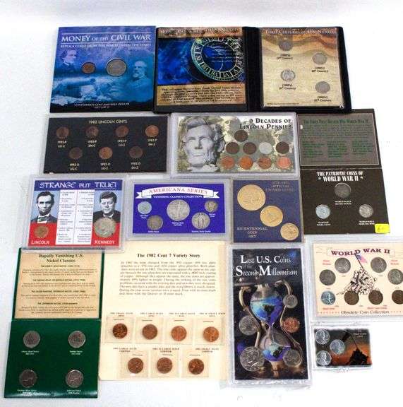 Sealed coin sets including , WW2 coin sets , 9 decades of lincoln pennies , three centuries of US Nickels, Vanishing classics collection with silver dime , quarter and half , 1982 lincoln pennies set , Civil war coin set , Gold Plated bicentennial coin set , and more
