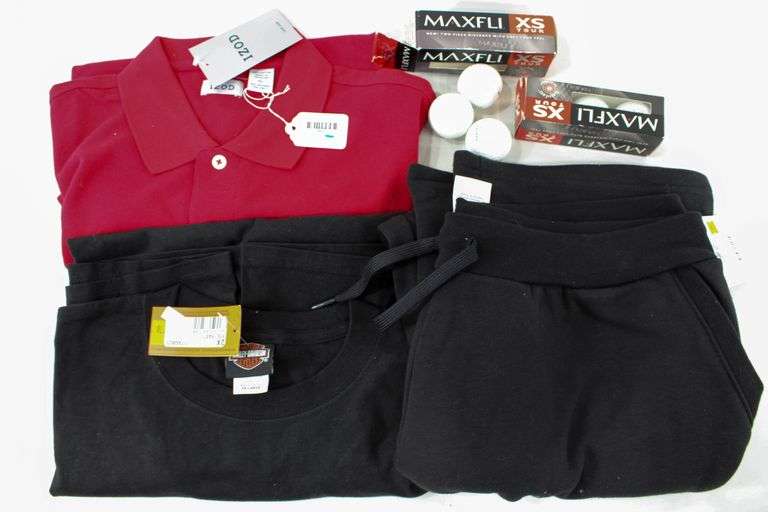 LOT 462 - IZod Shirt Size XL, Harley-Davidson Skull Pullover Size 2X, Maxfli Tour X Golf Balls, and More