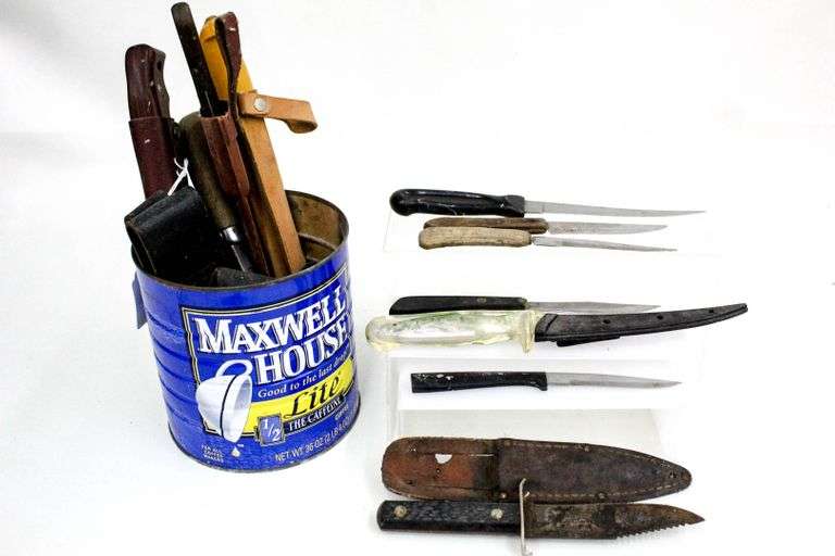 Knife Collection. Items include Buck Knife Fillet Knife, Vintage Buck 116 Caper Fixed Blade with Fold Over Leather Sheath and more.