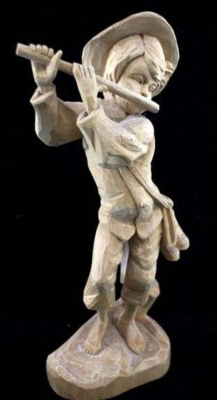 LOT 612 - Signed / Marked - Wood Carving Boy Musician Playing Flute Figurine 15"