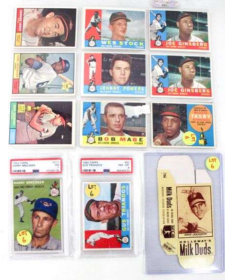21 1950's & 1960's Topps Orioles Cards. Features: 1954 Topps Breecheen PSA 7, Gus Triandos PSA 8, and a 1971 Milk Duds complete Box Davey Johnson marked 'scarce'
