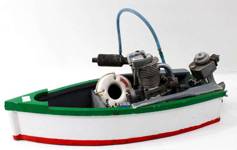 Allyn Sea Fury .049 Gas-Powered Toy Outboard Motor (Believed to be) on Miniature Wooden Flat-Bottom Rowboat Model Toy - and - Vintage Saito Gas-Powered Model Airplane Engine Made in Japan - and - More