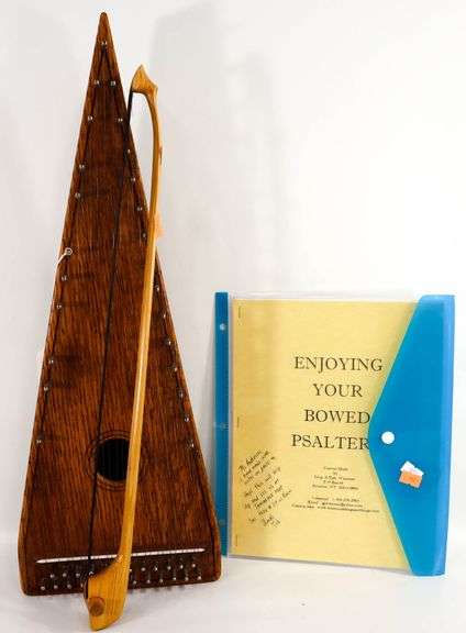 LOT 256 - Bowed Psaltery Triangular String Instrument with Bow and Book.