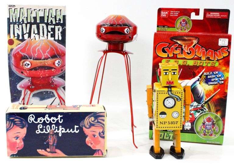 Vintage Space Fantasy Era Toys: Martian Invader Tin Toy by Schylling - and - Schylling Robot Lilliput NP 5357 Wind-Up Tin Toy - and - Bandai Cyclonians E.G.G. Bots, and