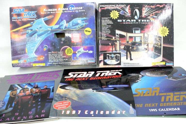 Star Trek memorabilia collection: Klingon Attack Cruiser model - and - Star Trek Generations Engineering Playset - and - 1995, 1996, and 1997 Star Trek The Next Generation Calendars - five items