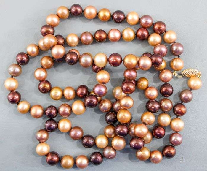 14 KT Gold and Genuine Knotted Pearl 36" Necklace with coppery hues.