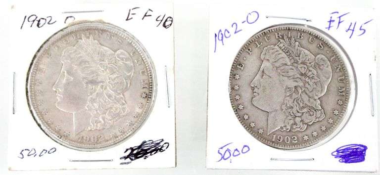 1902 "O" Morgan Silver Dollars. Two. Marked XF 40-45