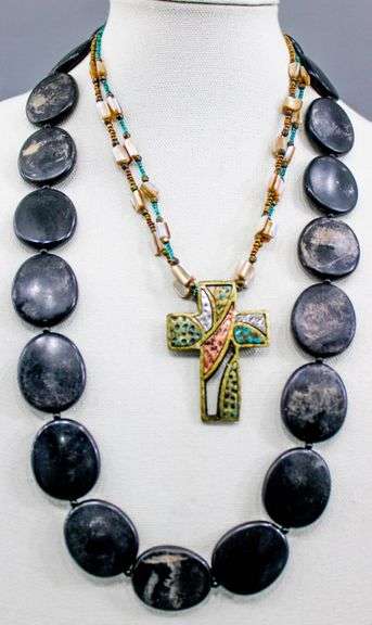 Black Ebony and Copper Disc Necklace , 30". and a double strand mother of pearl Necklace with a Cross Pendant, adjustable.