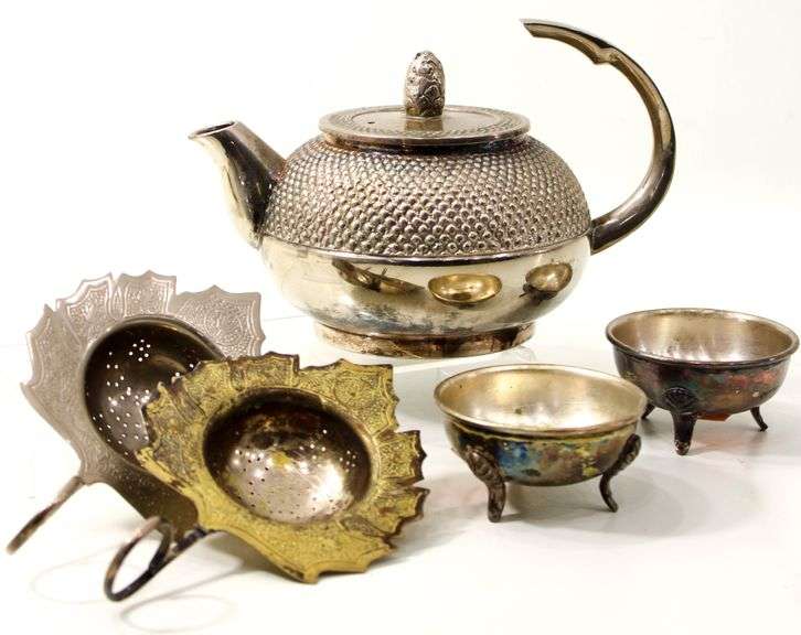 Vintage Silver Metal Overlay on Copper Acorn / Hobnail Teapot with Cups and Tea Strainers