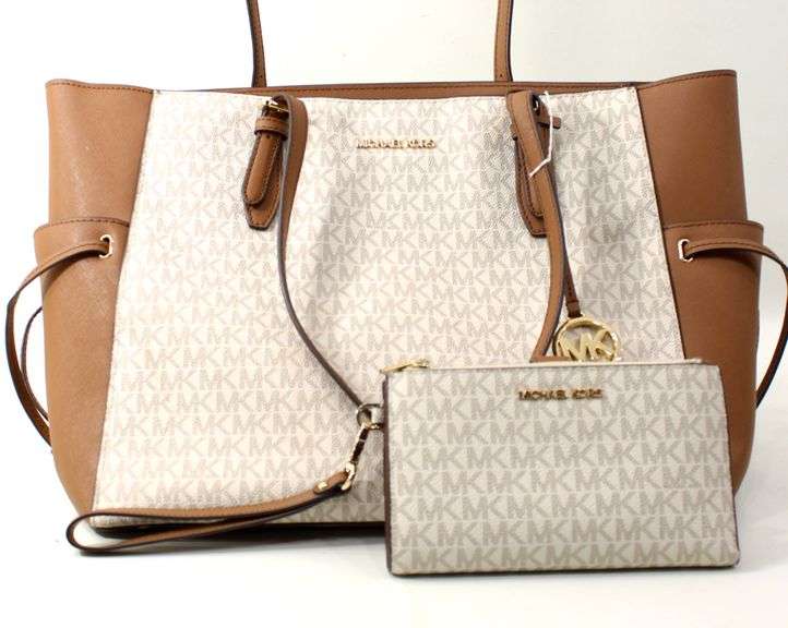 LOT 227 - Michael Kors "Gilly" Large Jet Set Travel Drawstring Tote MK Signature Handbag with Clutch Wallet