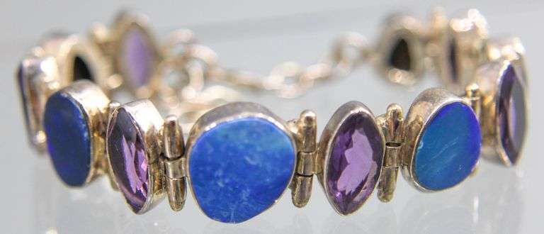 LOT 215 - Sterling Silver Amethyst (tested) and a blue iridescent stone Bracelet, adjustable.