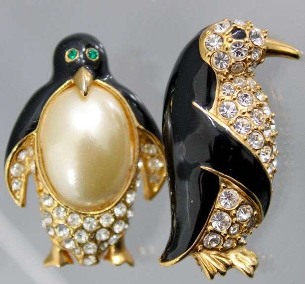 Vintage Krementz jeweled Penguin Brooch and her pearl bellied green eyed mate.