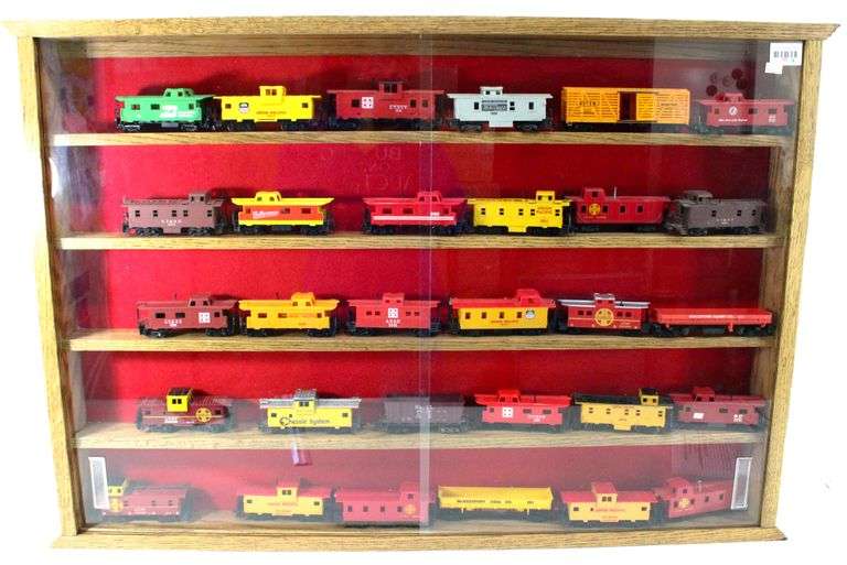 HO Model Train Freight Rail Cars and Caboose in Oak Display Case - 37½ x 25½ x 3¼ - See consignor note for details.