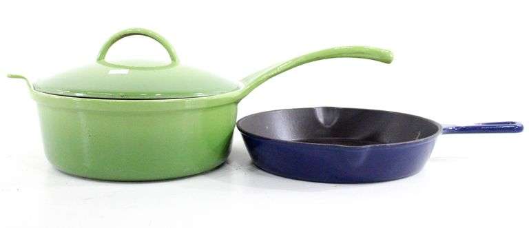 Sur la Table 10" Skillet in Blue Enameled Cast Metal - and - Denmark Green Enameled Metal Saucepan with Lid
