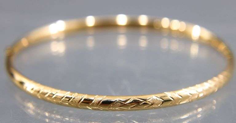 LOT 75 - 14 KT Gold hinged Bangle Bracelet, laser cut.