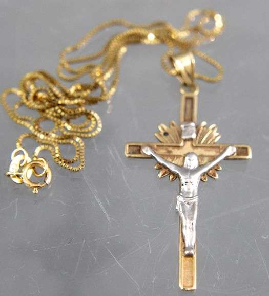 LOT 20 - 14 KT Gold box chain Necklace and Crucifix Pendant, 20". (2.4 gm)