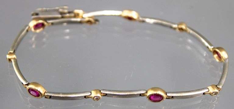 LOT 615 - 14 KT Gold, Diamond, and Ruby (both tested) Bracelet, 7.8g, in need of repair, in a gift box.
