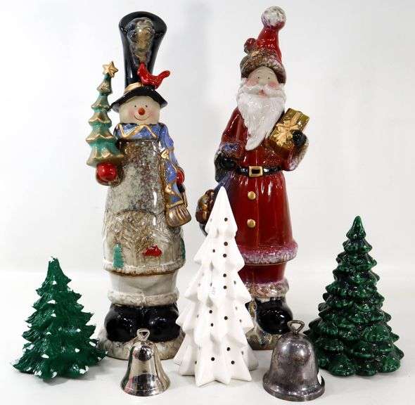 Holiday Figurines and Bells - Includes: Majolica Style Glazed Pottery Santa and Snowman Figurines - and - More