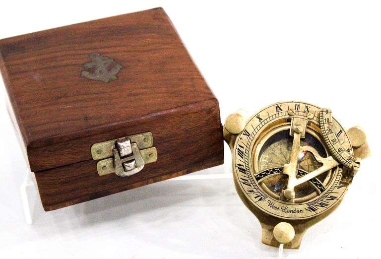 Vintage West London Brass Sundial with Wooden Case - Replica Vintage Maritime Navigational Instrument