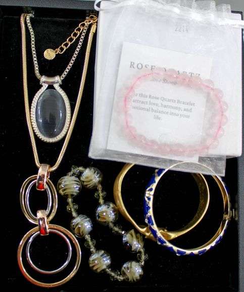 Open circle 30" gold Necklace by Alfani; box chain silver Necklace and gun metal gray cabochon Pendant; Bracelets including a rose quartz in a gift box.