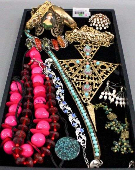 D&E Juilana Moroccan statement Necklace, BAB hinged Bangle, vintage domed rhinestone Brooch, (all stones intact) and more Necklaces, Bracelets and Earrings.
