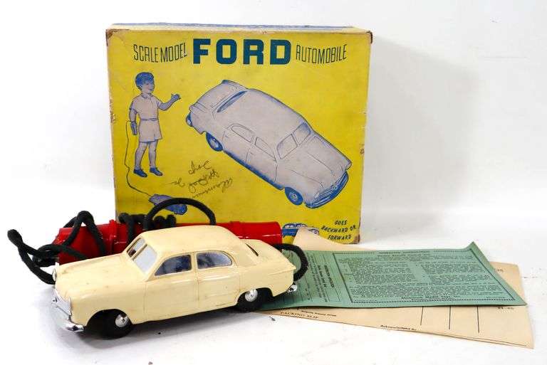 Vintage 1951 Scale Model Remote Control M-50 Cream Ford Car with Five Pole Electric Motor, Flexible Control Cable, Pneumatic Steering, Handy Powerpack Control by Aluminum Model Toys with Box, Original Purchase Receipt, and Operating Instructions / Registration Application