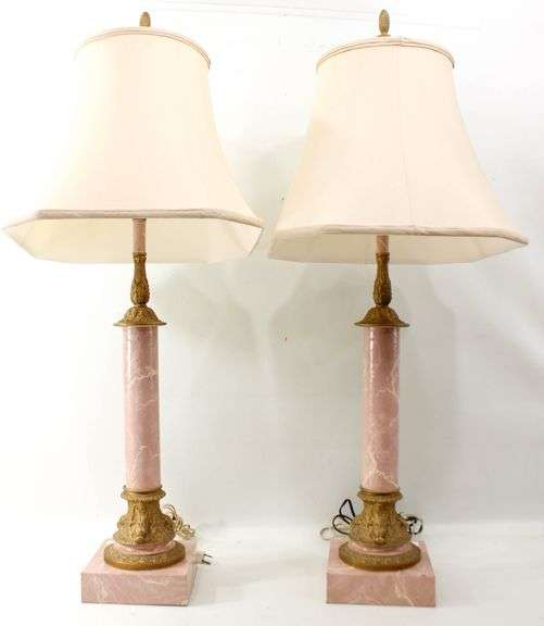 LOT 103 - Neoclassical Gilt Bronze and Pink Onyx (Believed to be) Candlestick Table Lamps with Shades