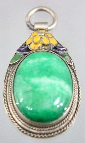 LOT 80 - Large Jade cabochon (tested) Sterling Silver Pendant with enamel flowers