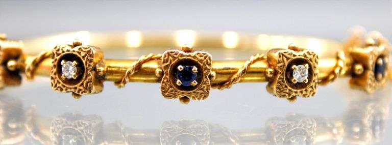 LOT 15 - 14KT Gold, Diamond, and Sapphire (both tested) Bangle Bracelet with a Safety Chain. 14.9g