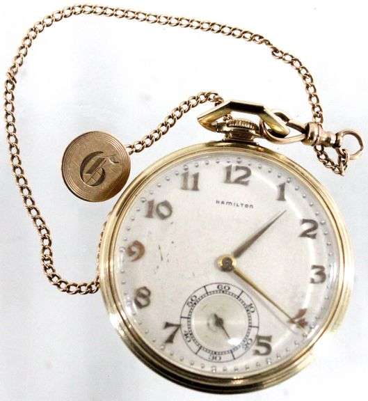 14K Gold Hamilton Pocket watch , 17 jewels , 917 movement , Wadsworth case, Chain and Fob marked 10K , Engraved on back for 25 years of service